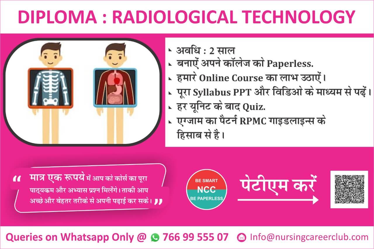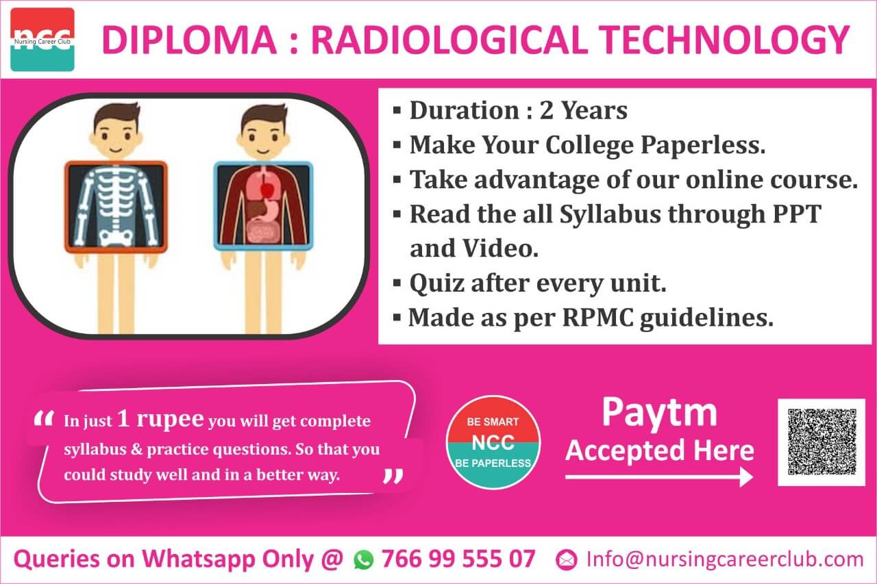 DIPLOMA IN RADIATION TECHNOLOGY (DRT) :- Admission process of this course is carried out based on the candidate’s performance in their high school exams. Some institutes may include their entrance exam score. Those entrance tests may include various quantitative tests. Diploma in X-Ray Technology is a undergraduate radiology course that is an electromagnetic radiation that penetrates within the human body and creates image of those structures on a photographic film. Radiological Technology is the production of medical images commonly called as X-rays. Students learn how to prepare patients undergoing X-rays and electrocardiogram procedures and endure the procedures are carried carefully. They also perform veni-puncture and injections as well as conduct back office laboratory tests. DRT-: Diploma in Radiological Technology (DRT) is a postgraduate diploma course. This is a unique professional diploma course combining various aspects of radio diagnostic technology and Medical Imaging. This is a nationally accredited two-year diploma program. They will get training in the use of radiographic equipment, learn how to position patients to get the best images and learn to critique images. You also develop knowledge and skills in: